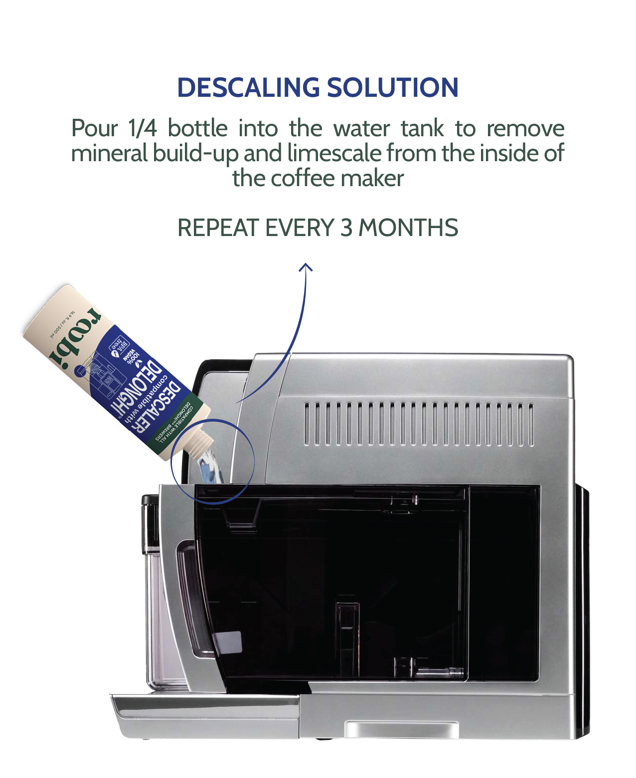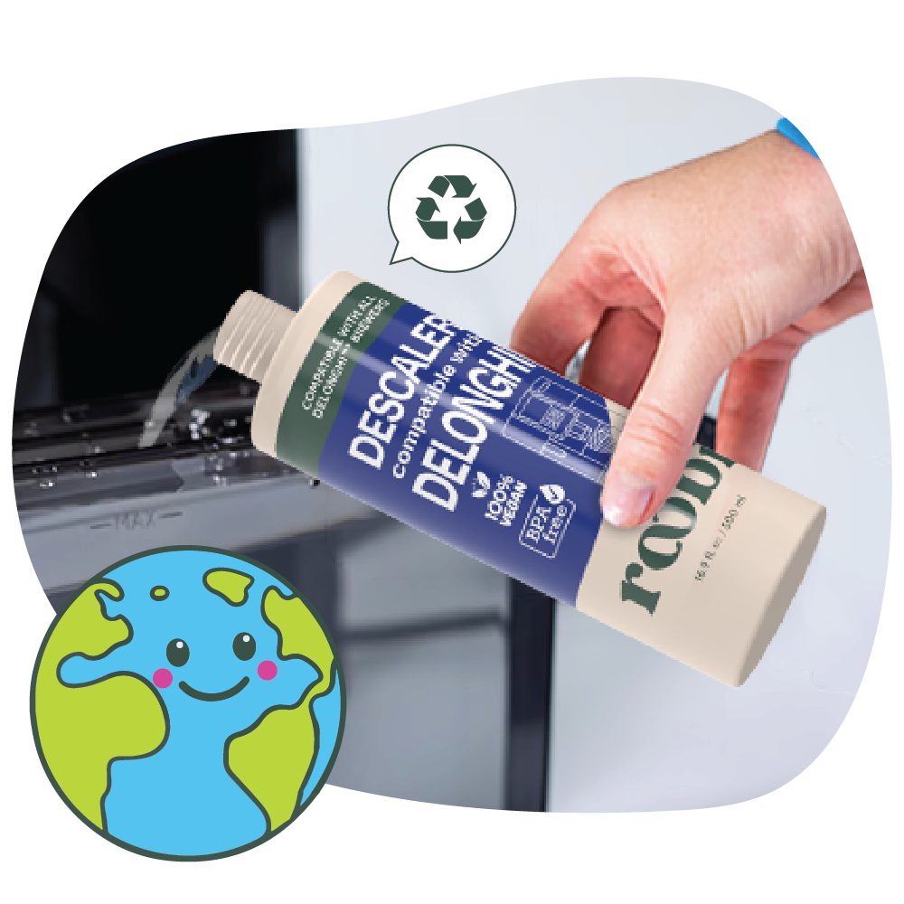 Experience eco-conscious descaling with Roobi: a 100% vegan, BPA, phosphate and paraben-free formula. Simply descale, repeat when necessary, recycle the box and bottle, and contribute to reducing plastic waste to save the Earth!